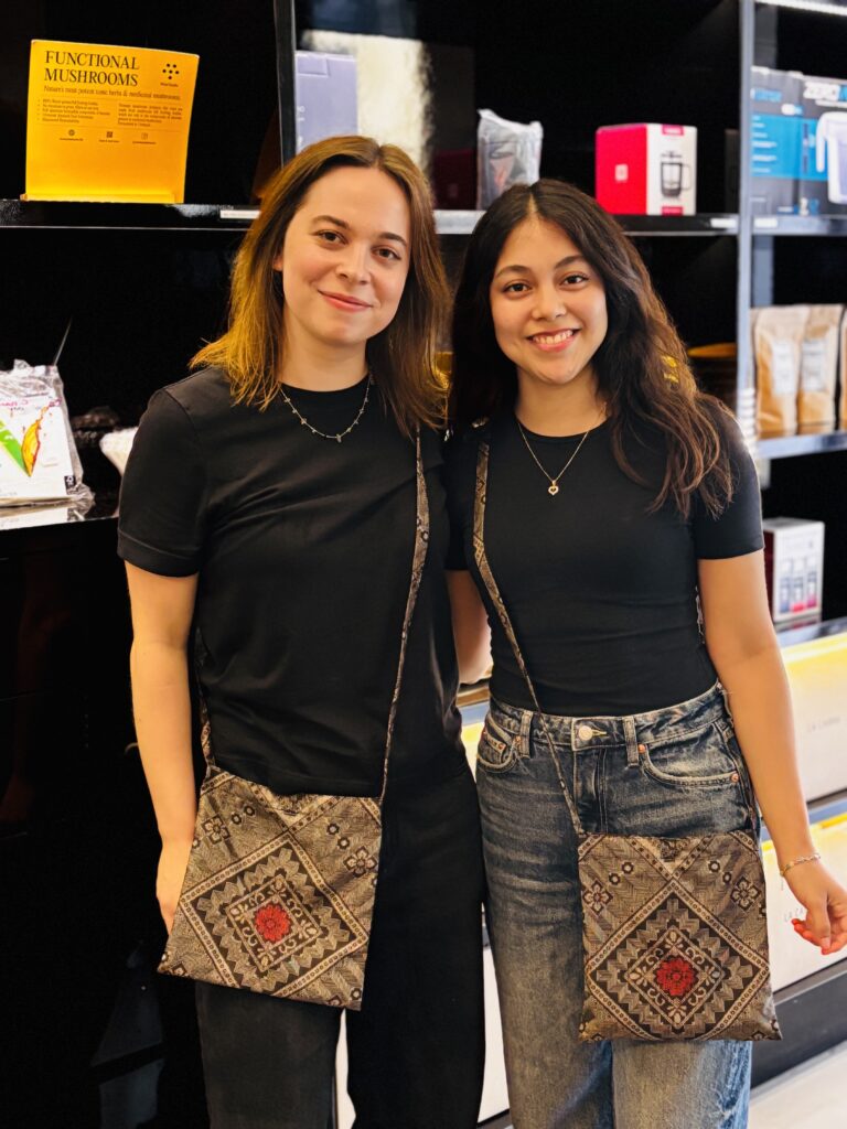 そして、一緒にカフェで働くスタッフの方に、お土産を持って来ました。軽くて日本が伝わるものということを考えて、私の実家にあった大島紬の生地で、友人にサコッシュを作ってもらい、手ぬぐいも入れました。